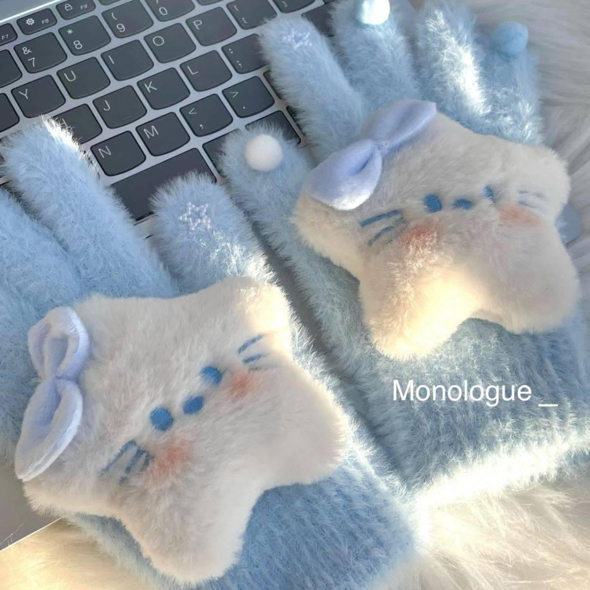 新款蓝色系蝴蝶结星星kt手套女冬季保暖甜美可爱卡通学生骑行仿寒