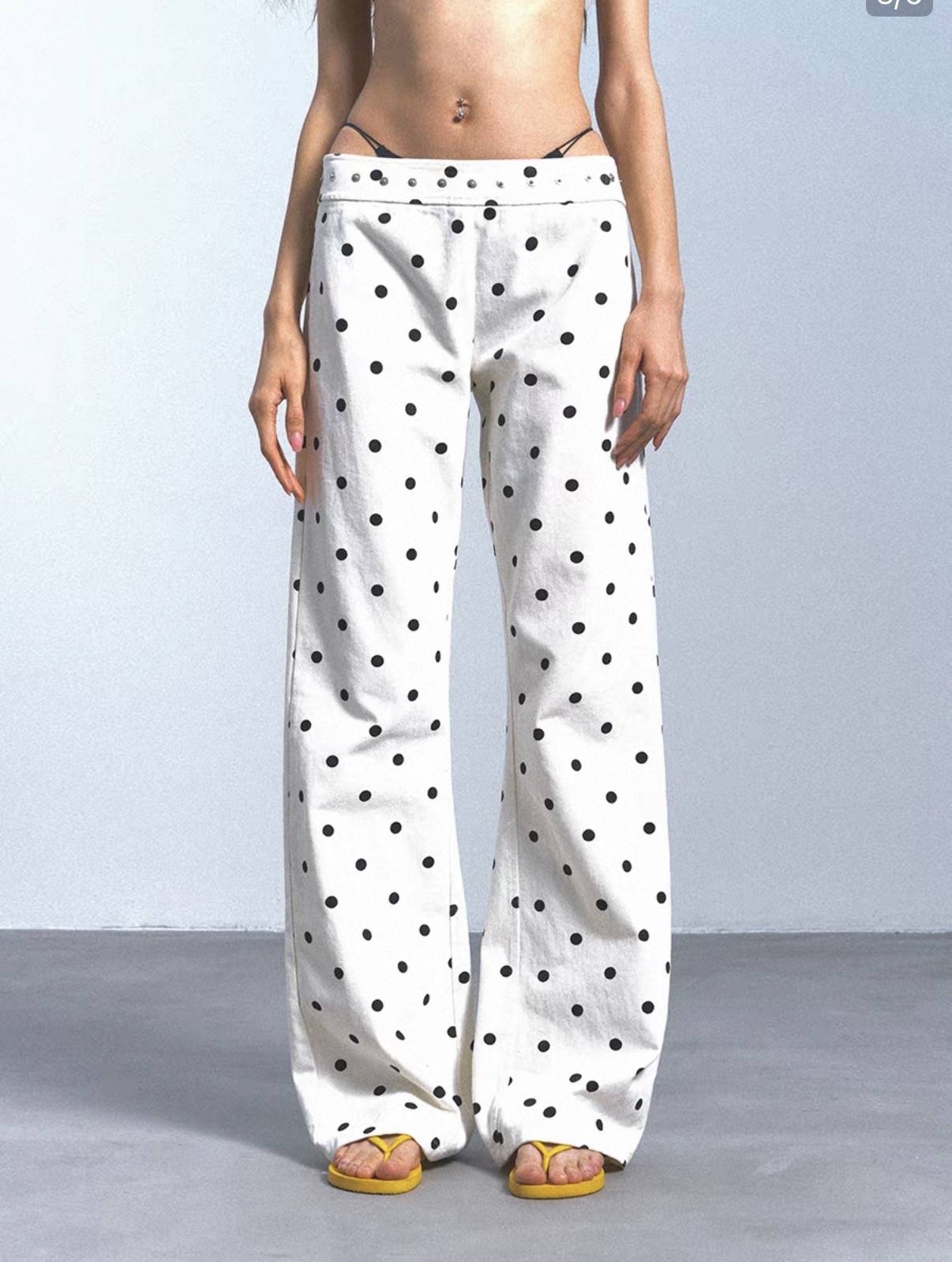波点钉饰棉质百搭舒适直筒中腰长裤