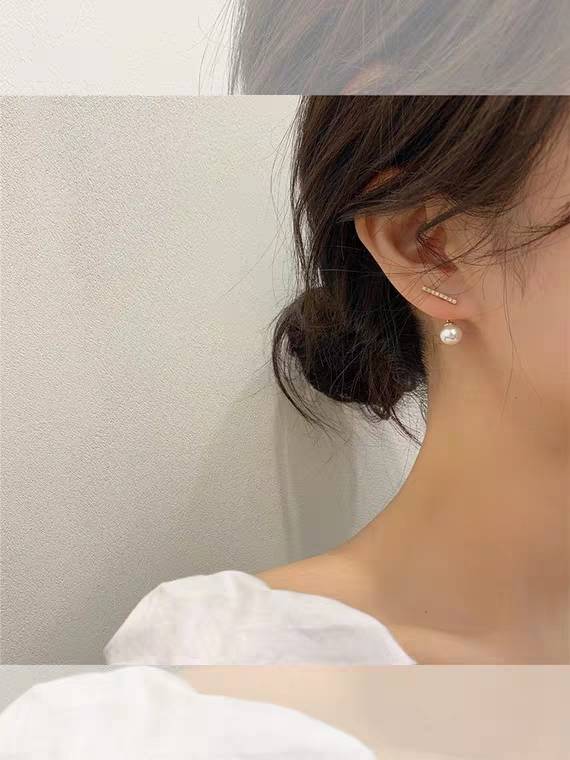 韩国东大门925银针简约水钻小一字珍珠耳钉百搭气质耳环少女耳坠