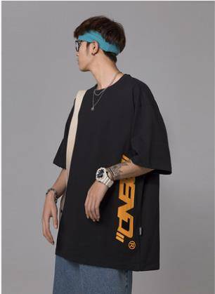 港仔文艺男夏季新款潮流短袖T恤宽松字母印花潮牌体恤五分袖上衣