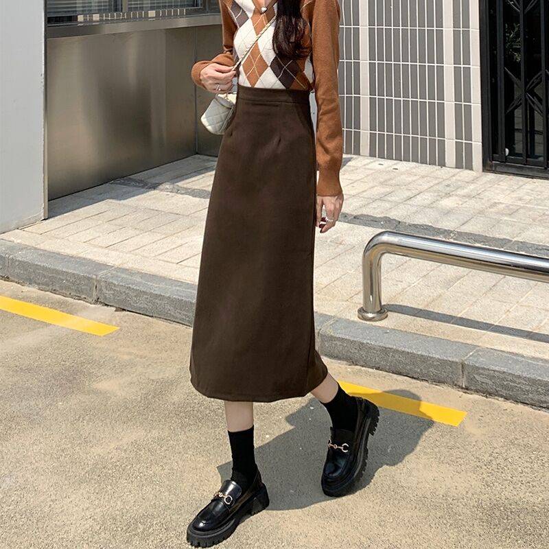 黑色毛妮裙子女秋冬中长款高腰显瘦A字长裙包臀半身裙