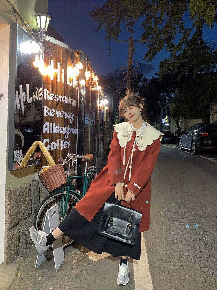 大衣2021新款女秋冬季娃娃领红色中长款宽松毛呢外套