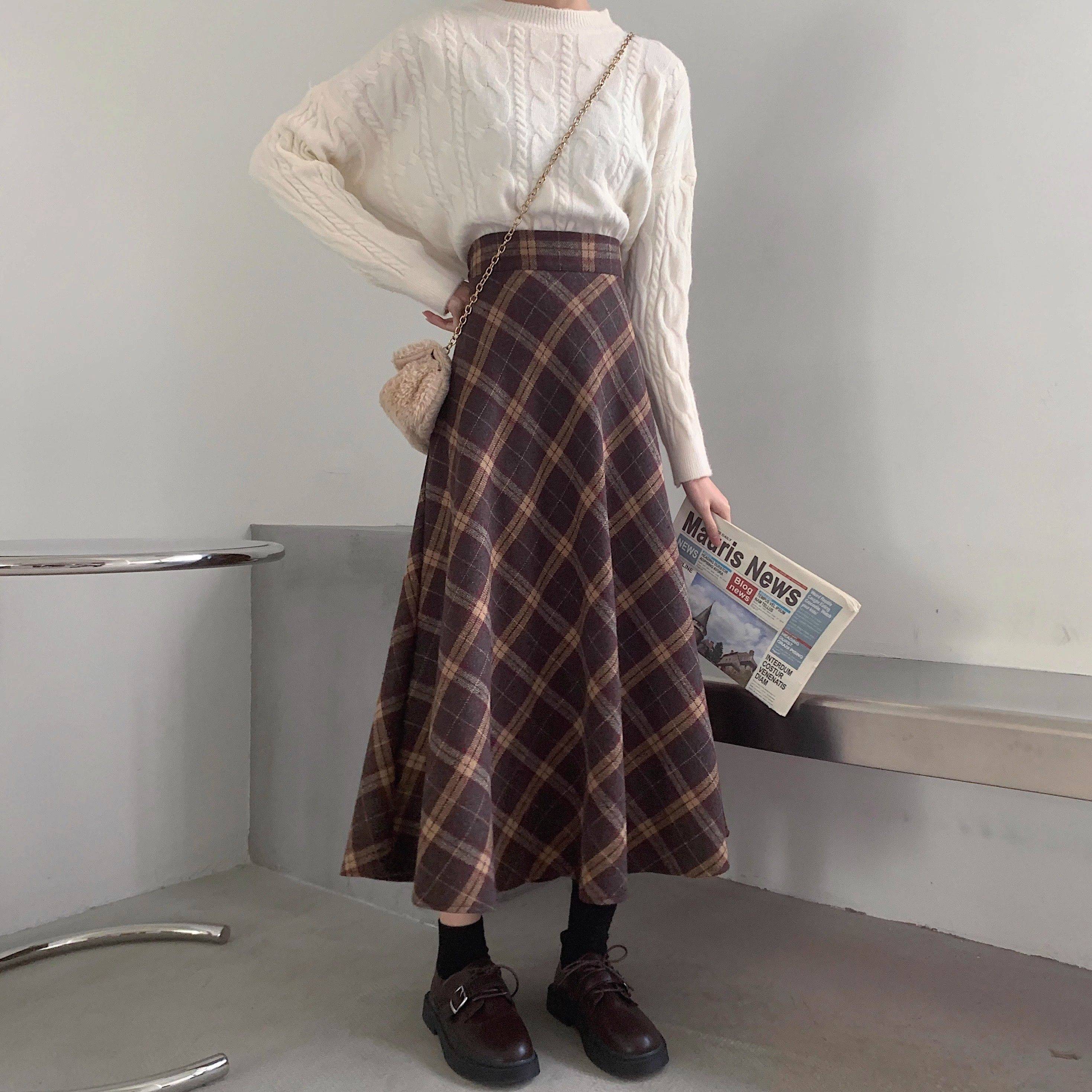 女大码胖mm秋冬复古高腰格子半身裙英伦风宽松遮跨显瘦中长款伞裙
