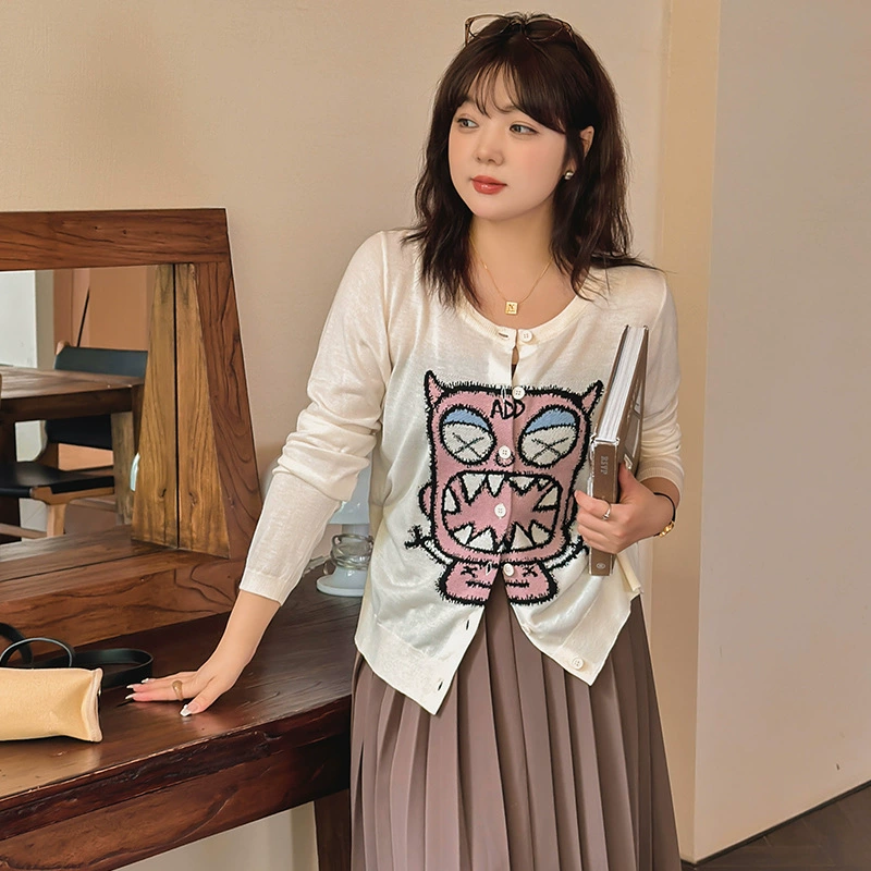 大码女装圆领提花小怪兽长袖上衣2023秋胖mm宽松针织开衫女21758