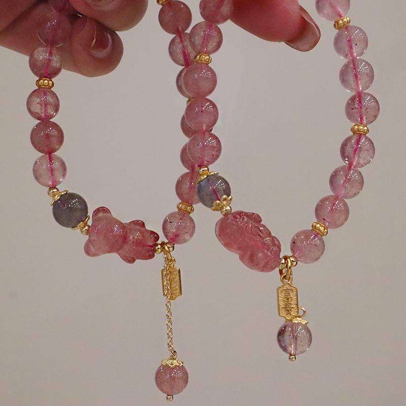 超仙天然草莓晶ins风小熊貔貅兔子手串灰月光真金电镀手链手饰品