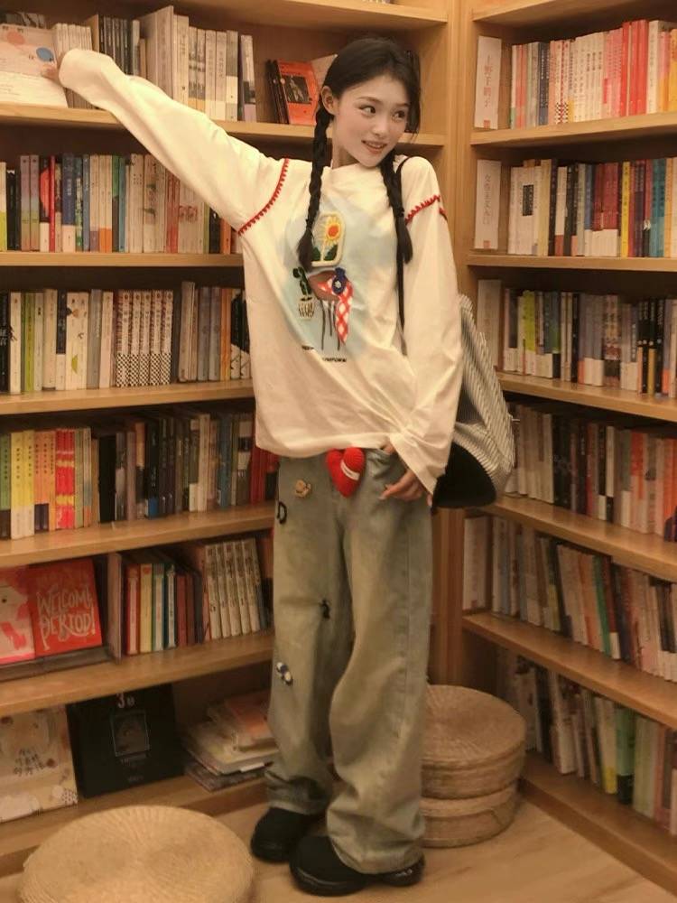 学院风美式t恤女早秋新款创意印花撞色长袖oversize宽松圆领上衣