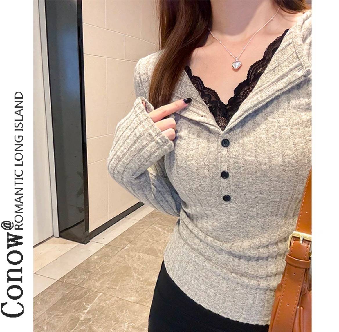 彩诺秋冬新款气质蕾丝假两件V领针织小衫女纯欲修身长袖打底上衣