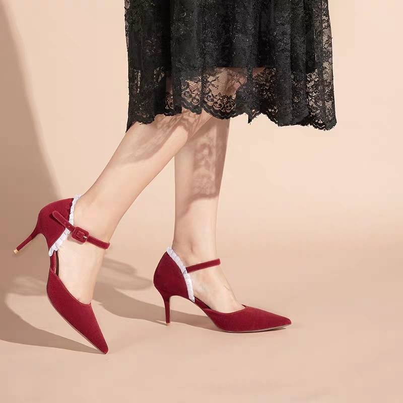 尖头浅口纯色天鹅丝绒荷叶边中低跟细跟高跟鞋单鞋