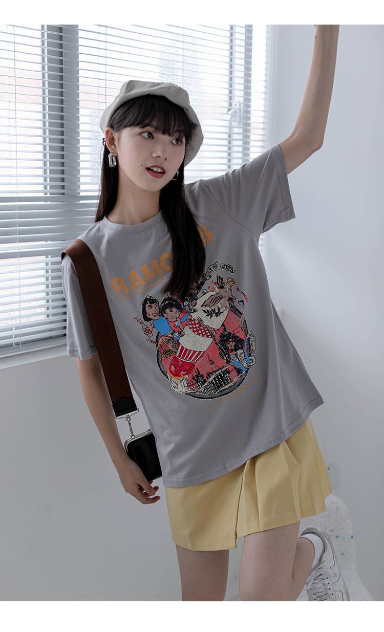 搞怪印花短袖t恤女夏季宽松显瘦休闲圆领美式复古灰色上衣