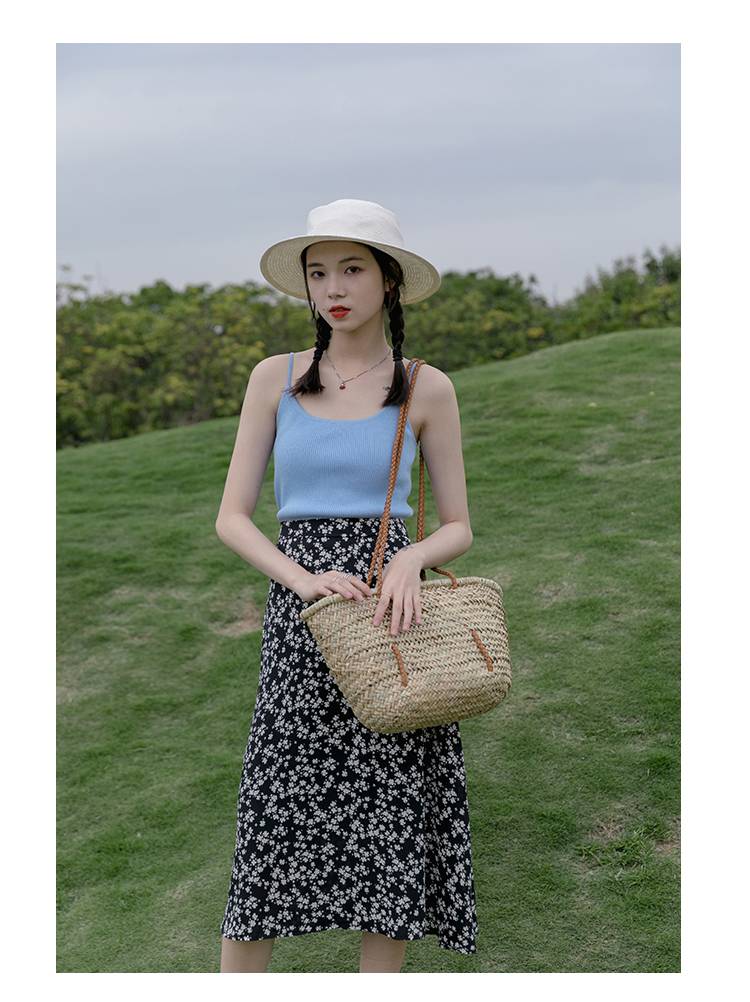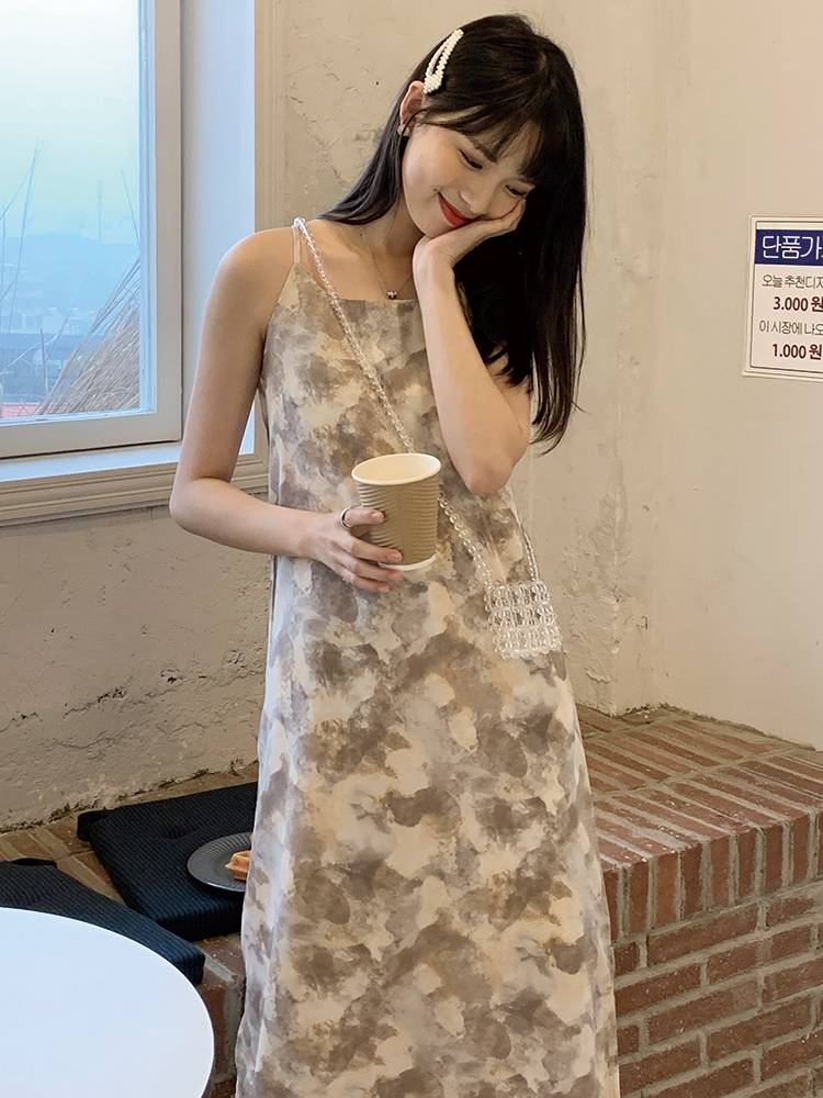 2021年春季新款吊带水墨印花连衣裙女可调节总长款无袖裙子