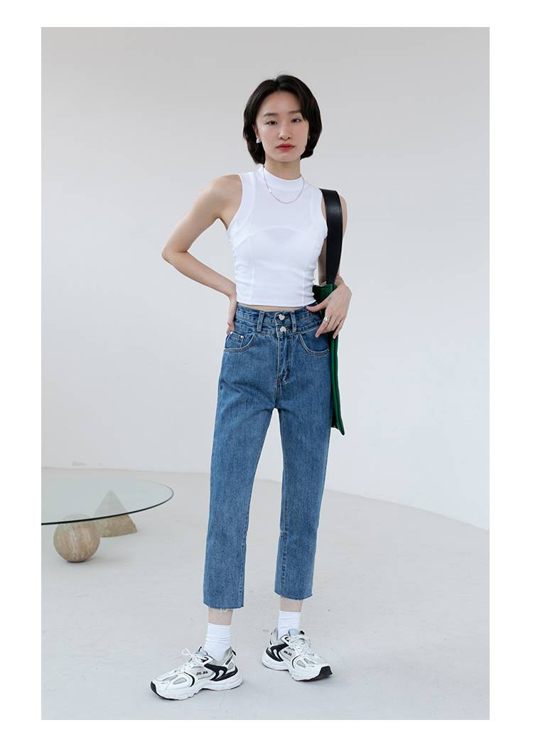 牛仔裤女2021年夏季新款设计感后绑带小个子高腰直筒九分裤