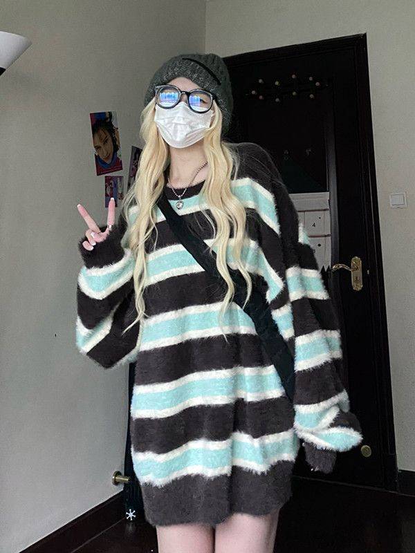 高级感条纹毛衣外套女秋冬宽松外穿复古日系慵懒风上衣2022新款冬