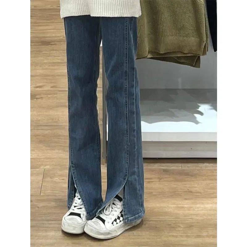 高腰复古蓝色微喇叭开叉牛仔裤女2022新款弹力显瘦辣妹拖地长裤子