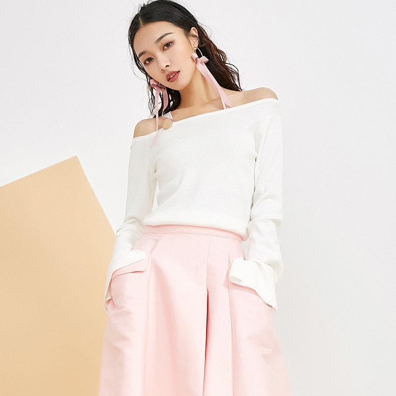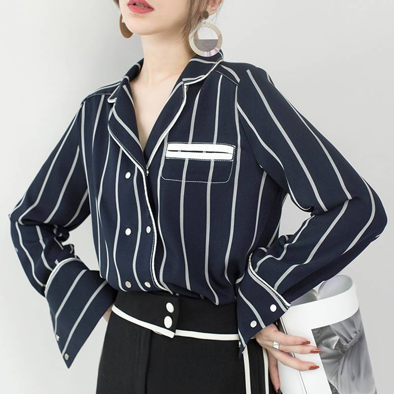 2018新款春装新款漏锁骨上衣心机宽松蓝色竖条纹衬衫女长袖