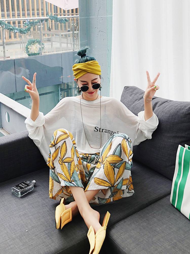 开叉垂感阔腿裤女夏2018新款高腰休闲裤超火花裤子棉麻宽松九分裤