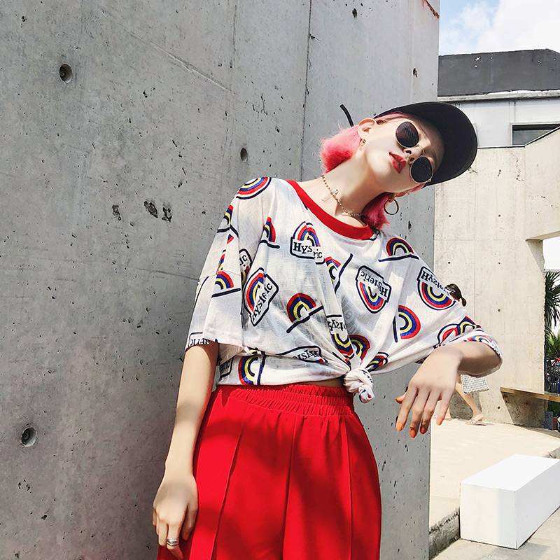 彩虹印花t恤女短袖夏2018新款ins超火的上衣宽松韩版透视学生体恤