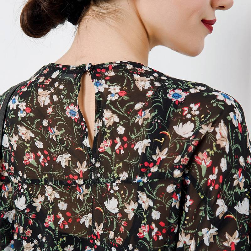 高端定制宽松娃娃碎花木耳边睫毛蕾丝拼接喇叭袖真丝上衣现货