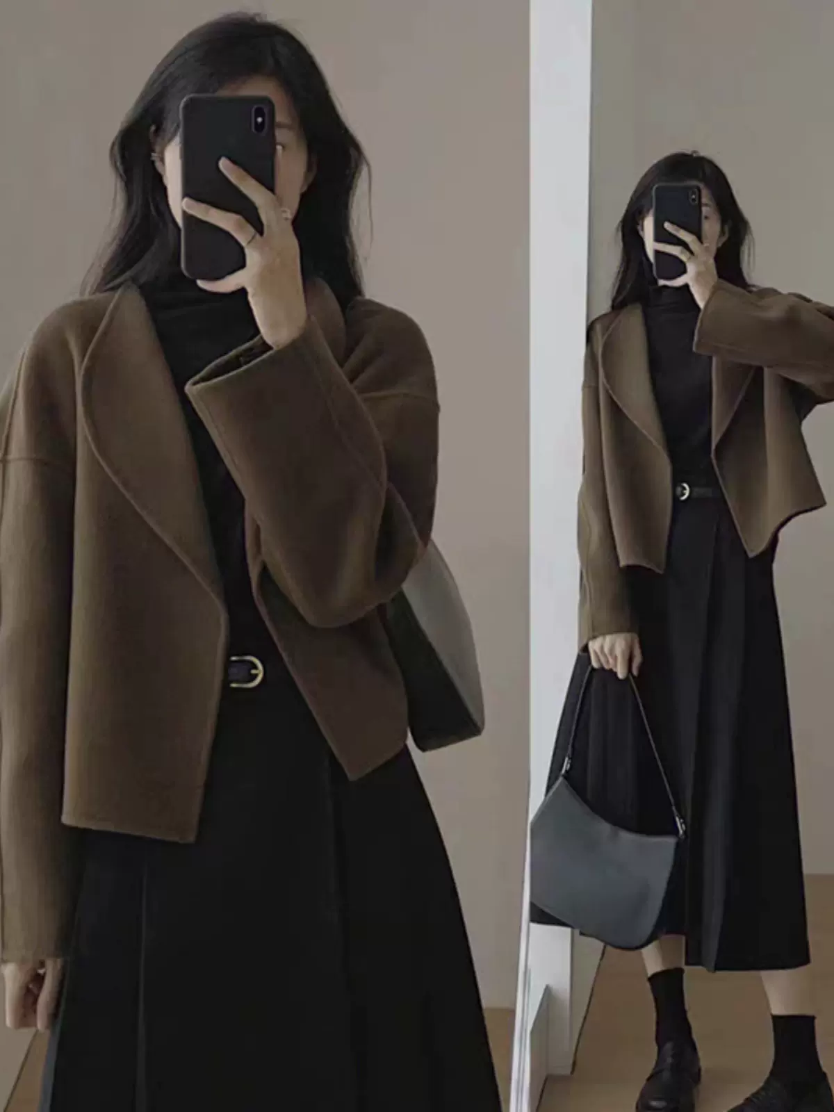 大码女秋冬时尚穿搭配一整套微胖mm显瘦美拉德毛呢外套两件套装裙 269.00 已售:5件