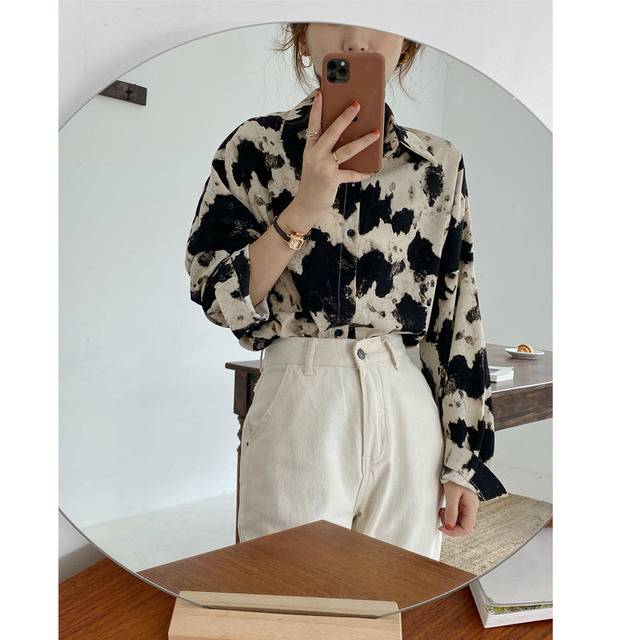 厂家直销2020秋冬新款女装洋气奶牛纹晕染衬衣是时尚宽松复古衬衫