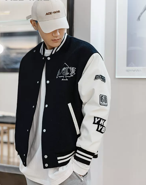KT2022秋冬新款棒球领棉服女毛呢拼接PU皮刺绣夹克情侣款
