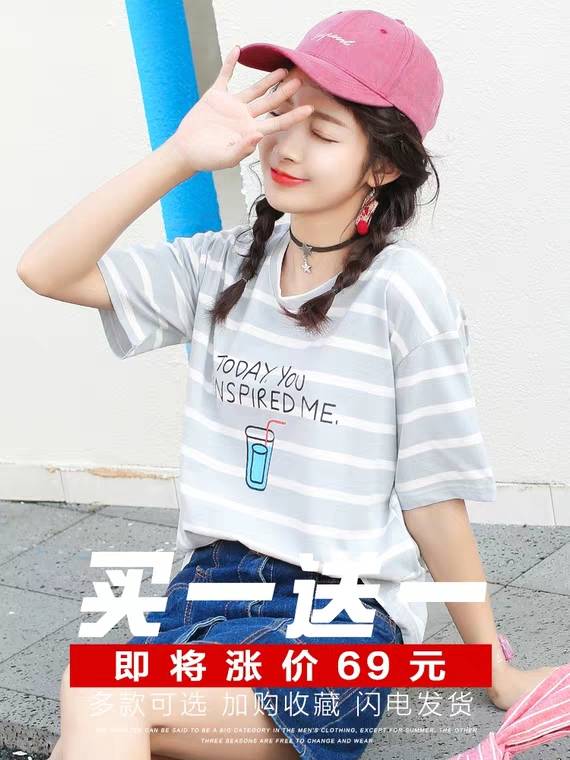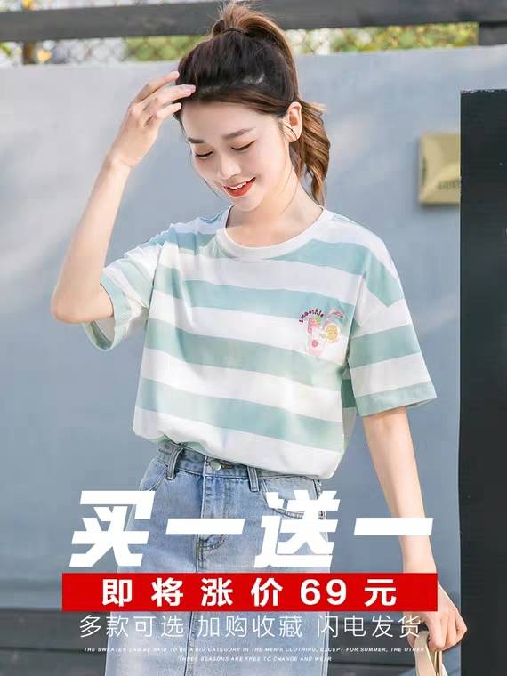 2件短袖t恤女夏季2019新款春装打底衫纯棉条纹宽松半袖女装上衣