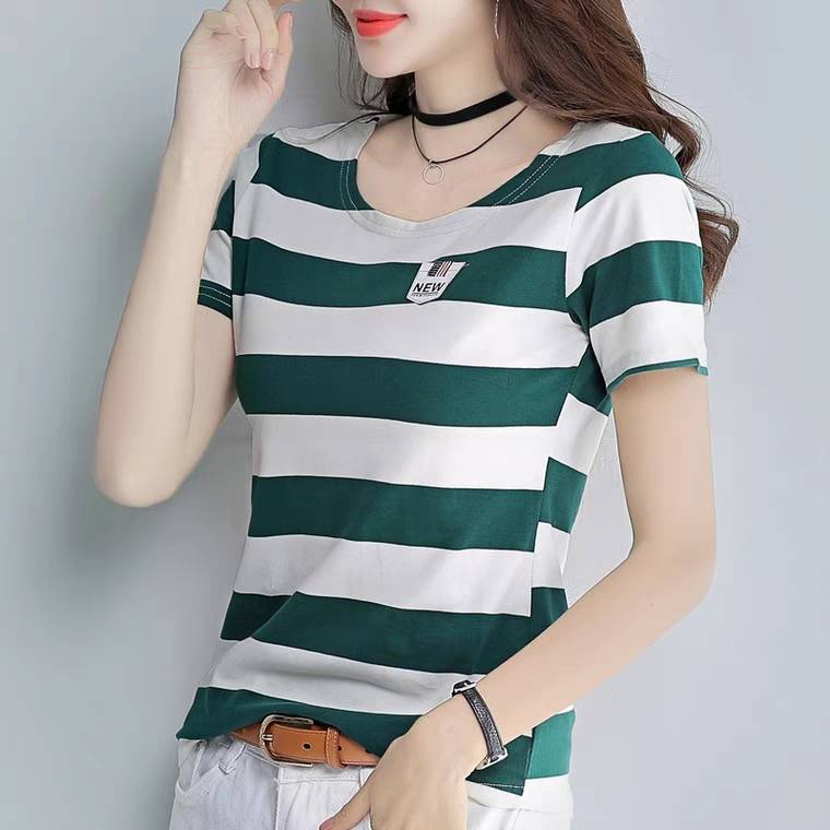 条纹t恤女短袖丅修身百搭上衣服夏季2019新款韩版学生纯棉体恤衫