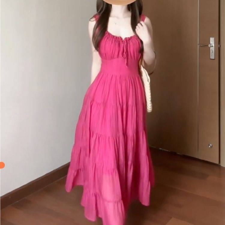 韩系玫瑰红背心连衣裙2024新款夏日海边休闲连衣裙