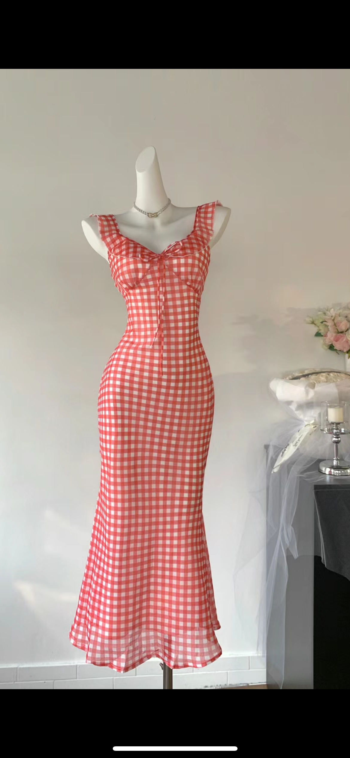 吊带式 红白格子吊带裙子 辣妹收腰款