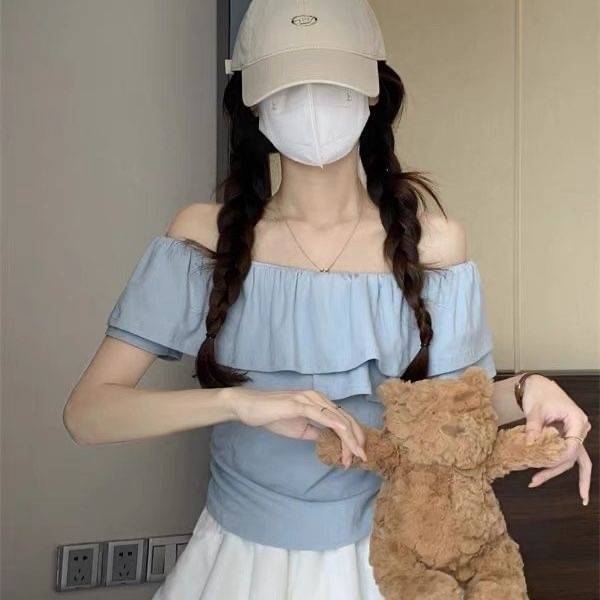 小众时尚蓝色一字肩 2024夏款