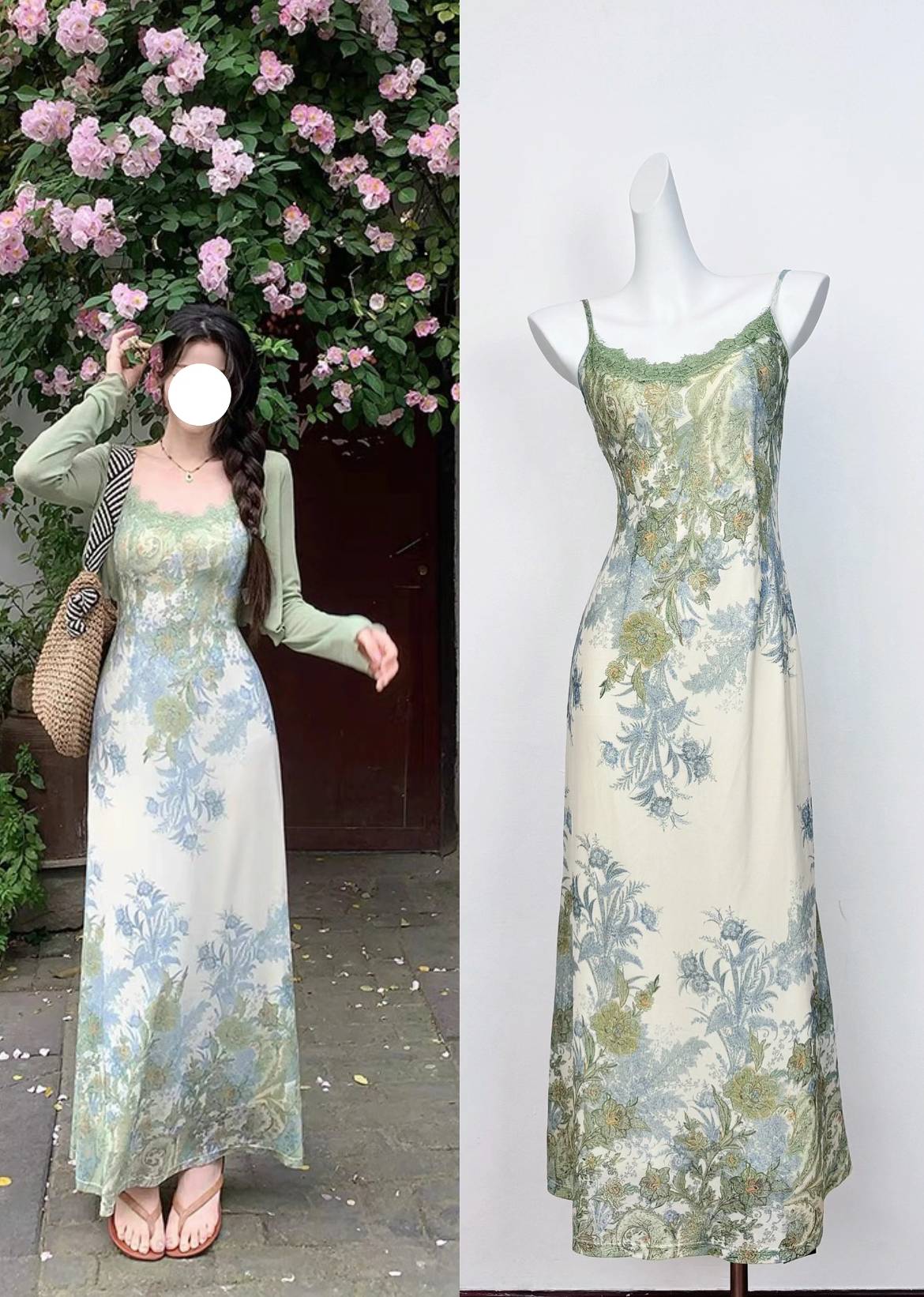 新中式复古花印连衣裙夏日吊带
