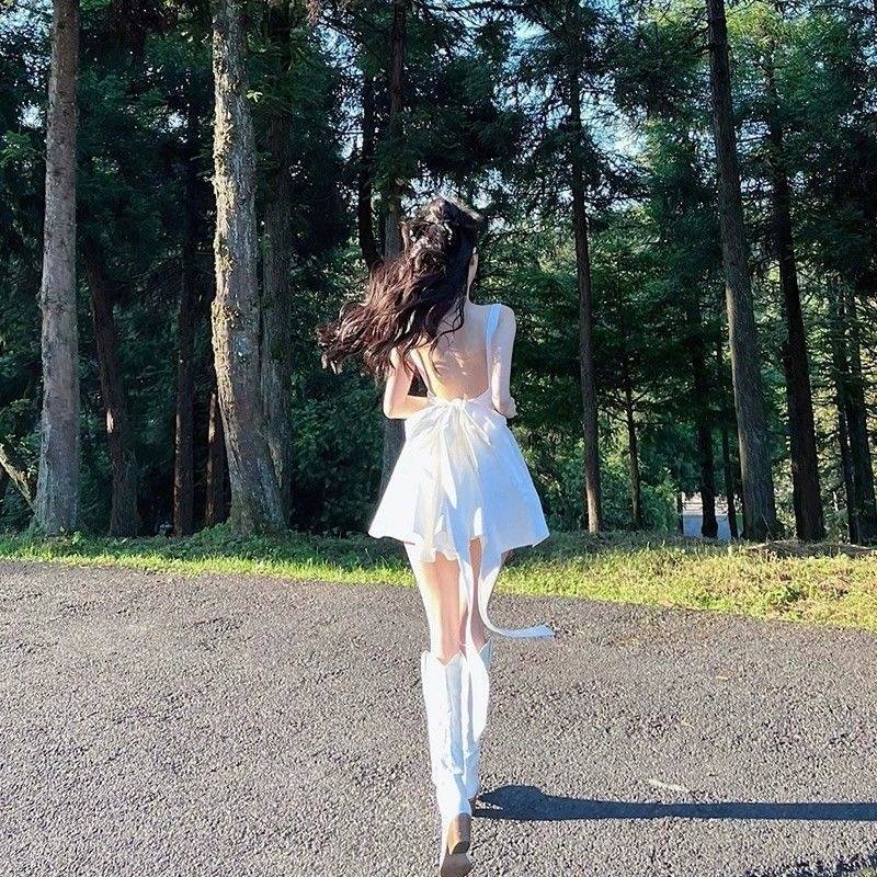 2024初恋白月光露背裙子蝴蝶结设计