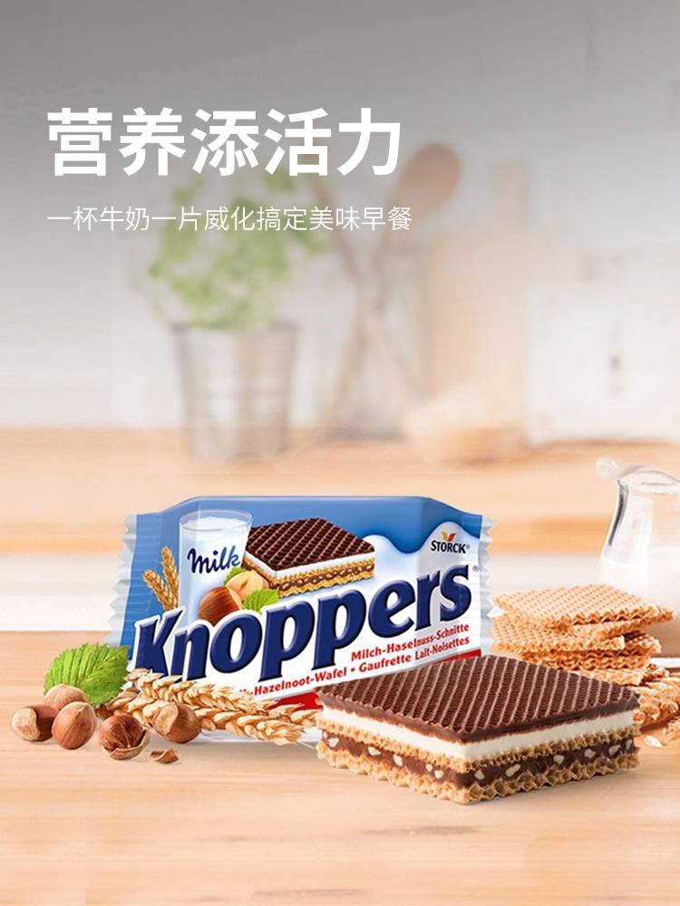 【进口】德国knoppers五层牛奶榛子巧克力威化饼干25g*10袋夹心零食
