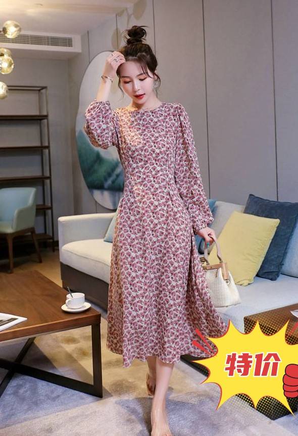 2023年秋装新款碎花雪纺连衣裙中长款收腰显瘦长袖裙子