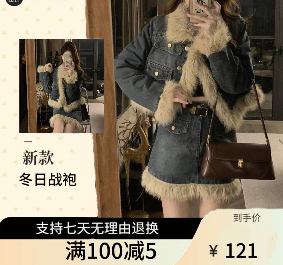 冬日战袍牛仔套装女美拉德毛毛拼接夹棉短外套高腰半身裙两件套