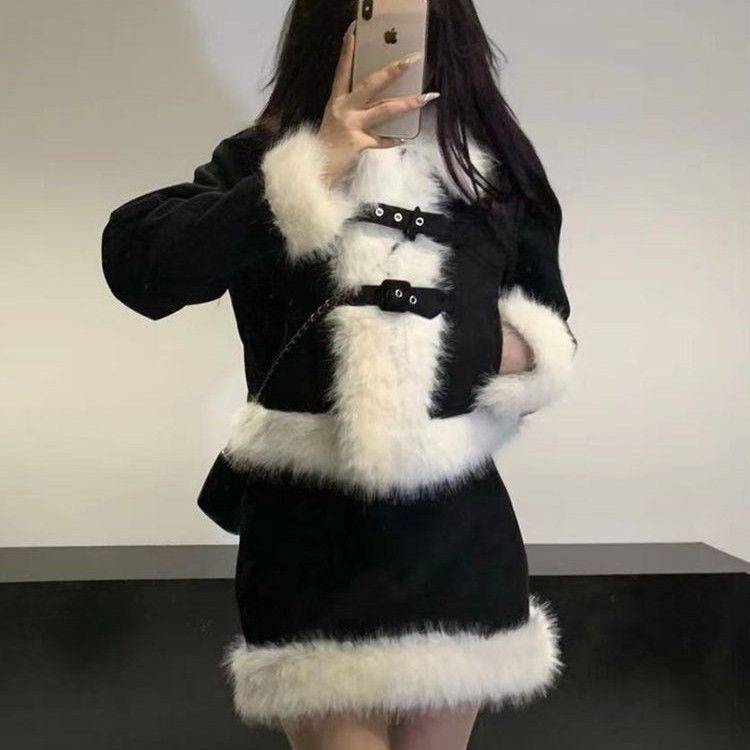 【雪国精灵】冬季韩版甜美加厚保暖毛毛拼接外套 长半裙两件套装