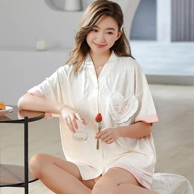 睡衣女夏季短袖开衫V领提花白色2022年新款家居服套装