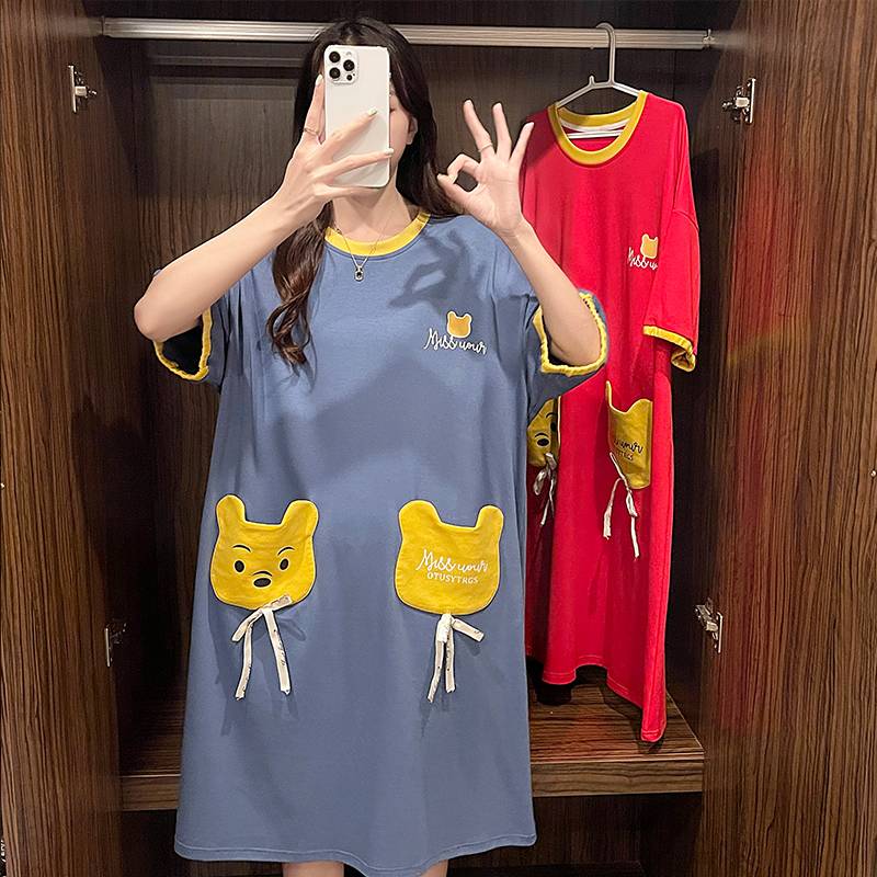 睡裙女夏季卡通红色小熊印花圆领中长款宽松休闲睡衣家居服新款