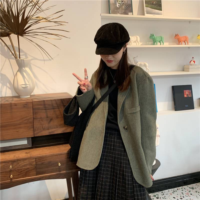 2021新款英伦风灰豆绿双面羊毛羊绒西装港风chic外套女