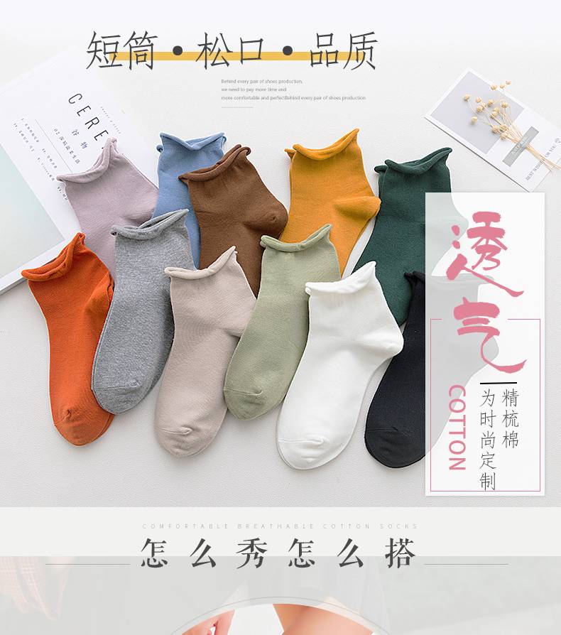女短袜子卷边船袜春夏棉袜薄款低帮百搭日系文艺纯色短筒松口袜