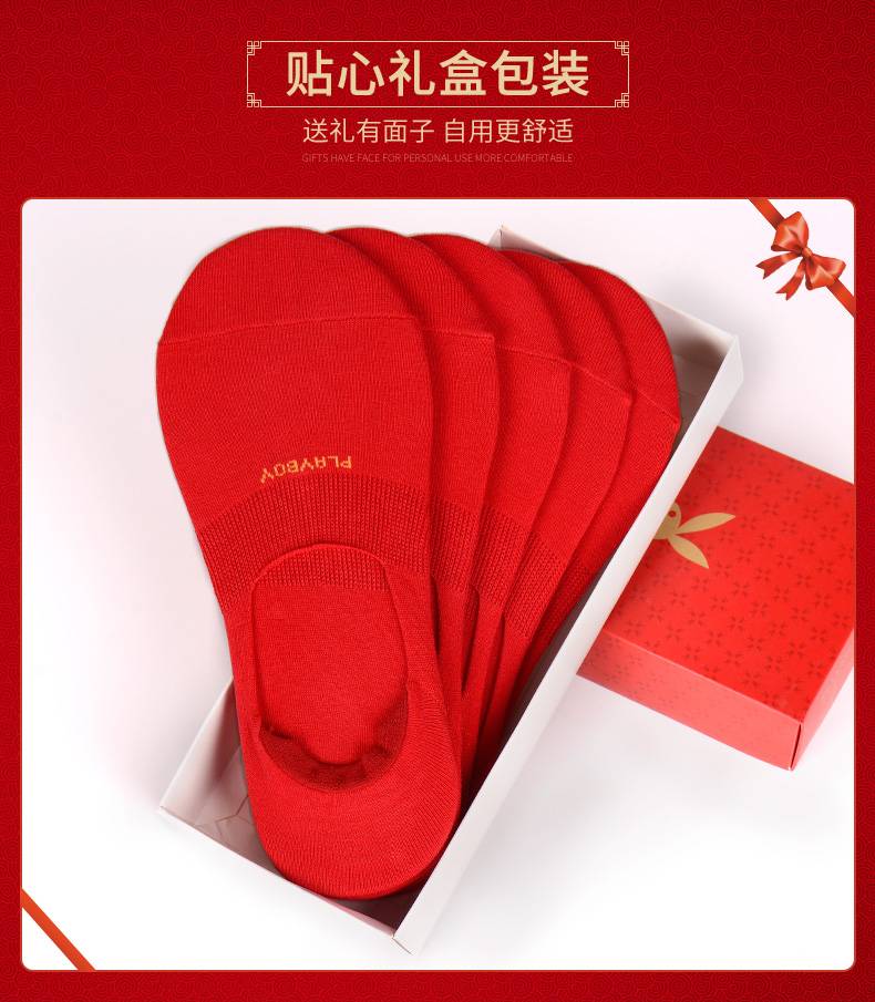 花花公子本命年隐形红袜牛年男士女士短袜结婚棉袜纯大红色船袜子