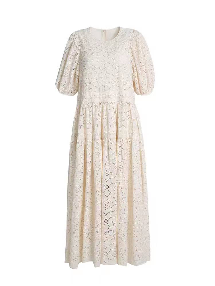 现货 重工纯棉米白色蕾丝连衣裙女夏中长款显瘦仙女泡泡袖长裙女 109.00 已售:0件