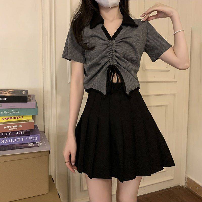 女夏季设计感撞色短款辣妹别致高腰学院风百褶裙