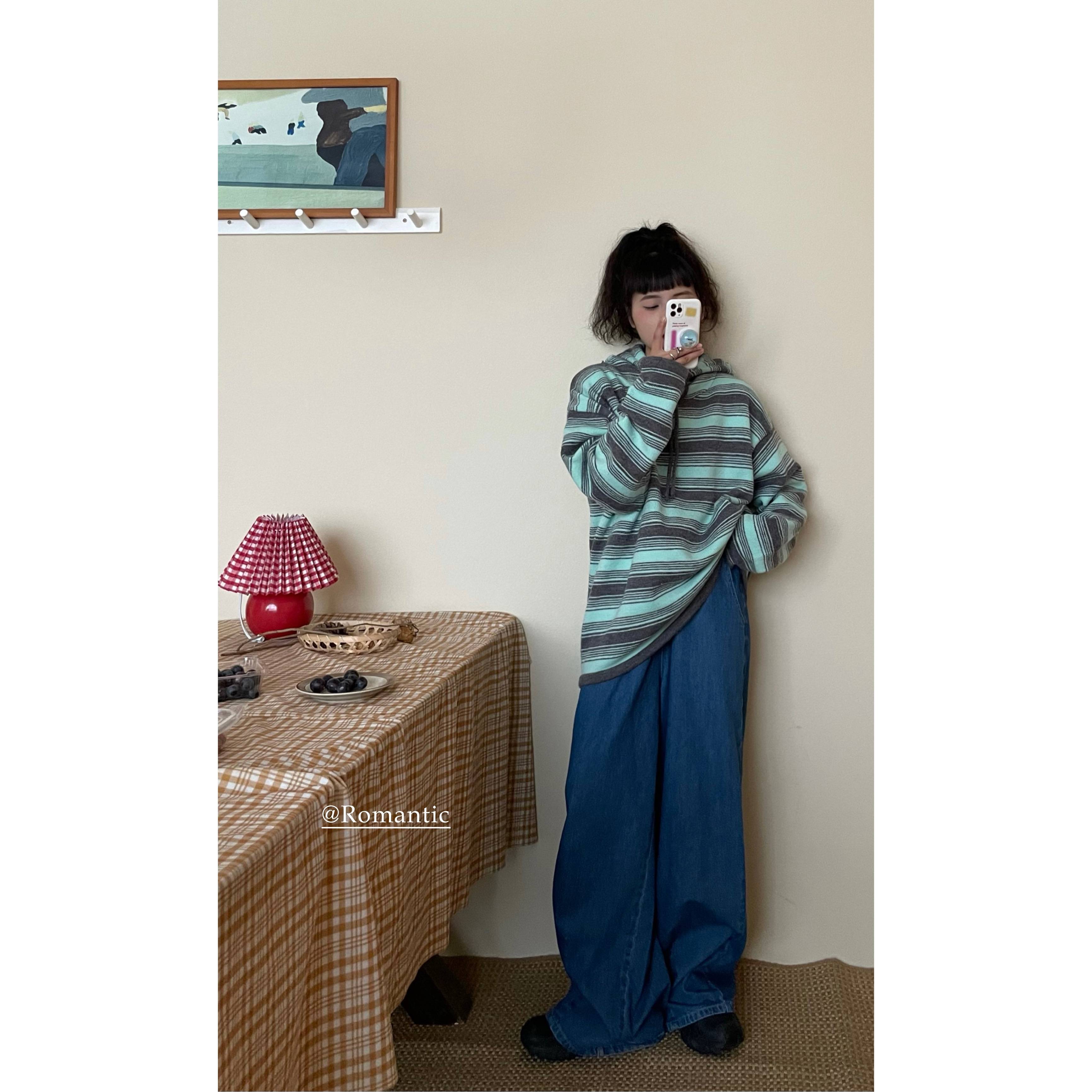 【一嘴一个小志】日系灰绿条纹连帽毛衣
