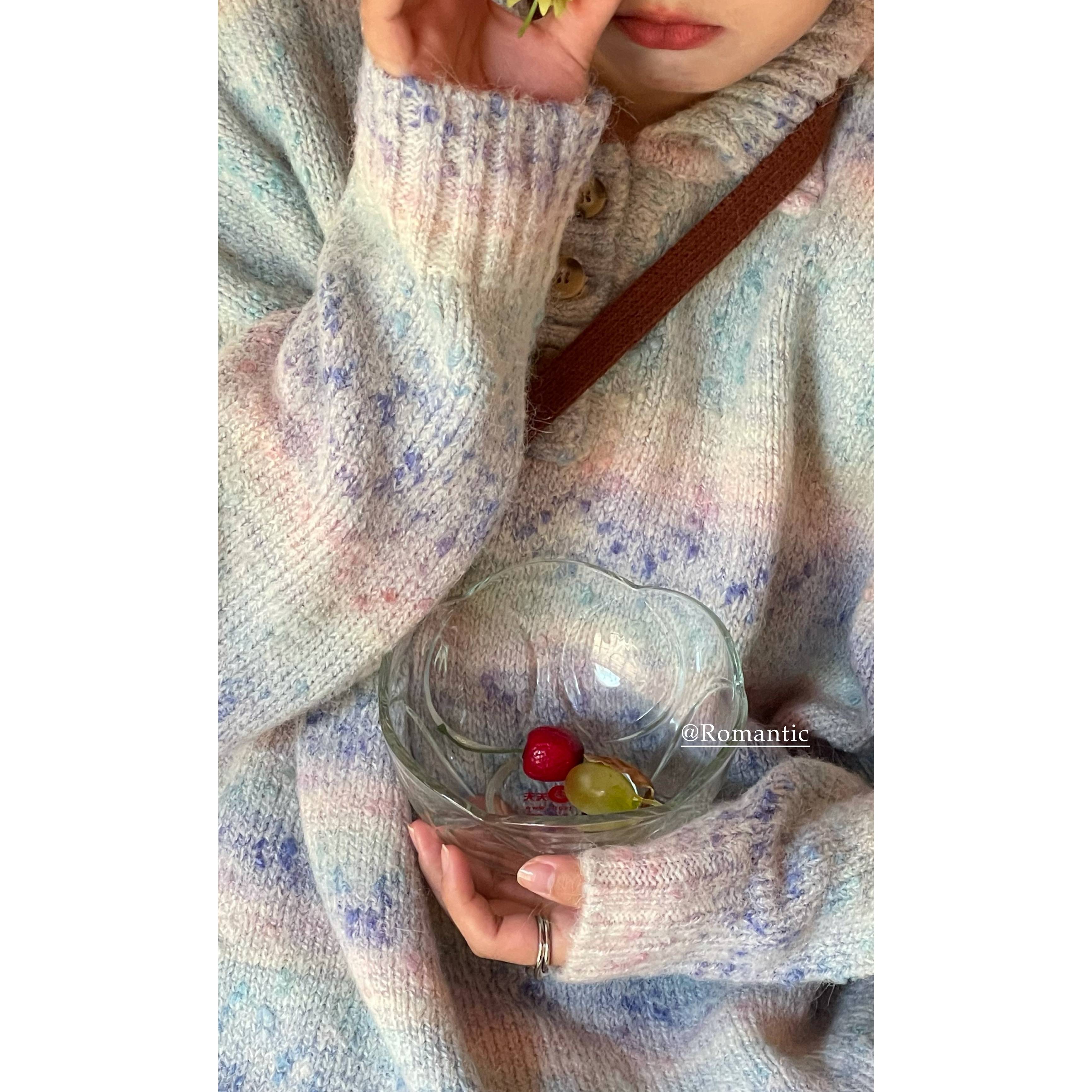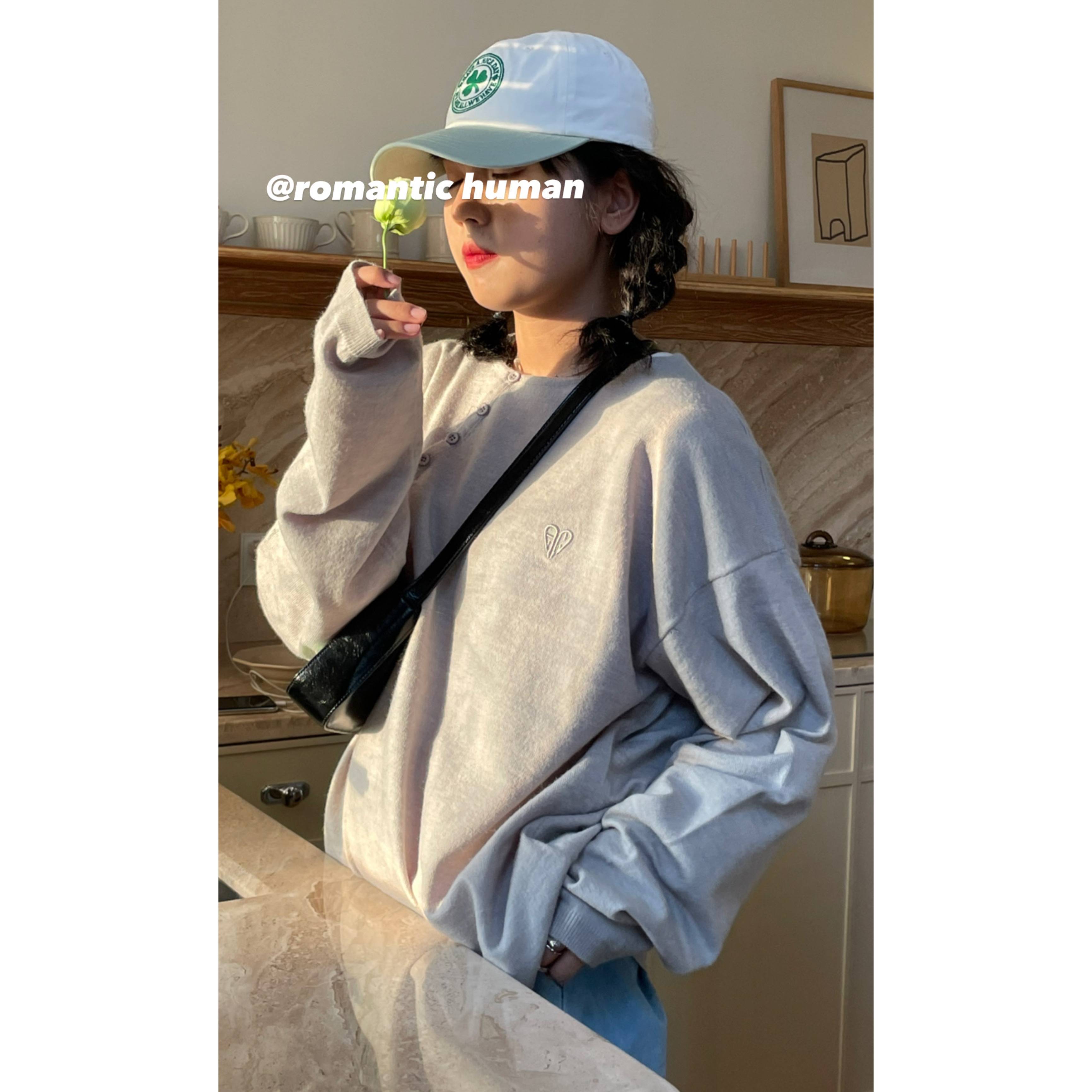 一嘴一口小志灰色刺绣针织衫女秋季宽松圆领上衣慵懒风圆领毛衣外套