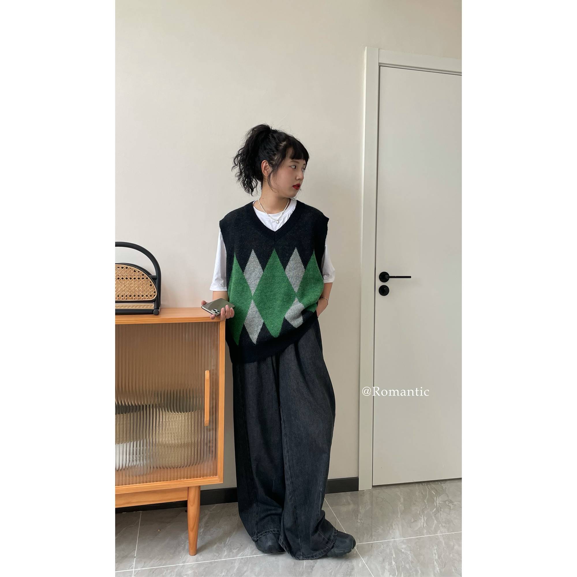 一嘴一个小志复古菱格针织马甲女2021秋季新款日系V领百搭外穿毛衣背心