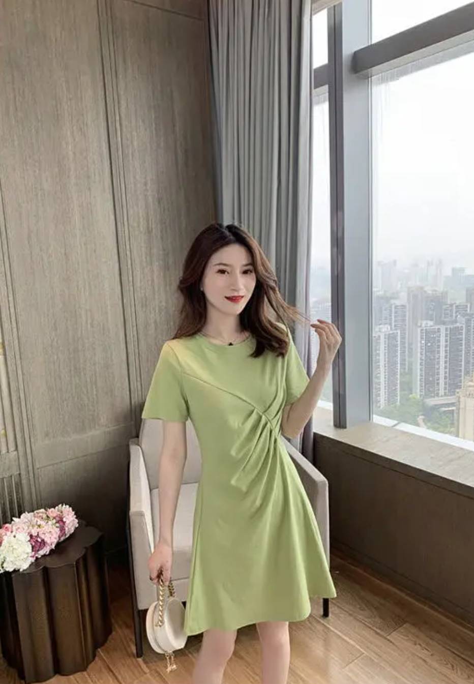 2021夏季新款韩版牛油果绿褶皱连衣裙女小个子显瘦简约百搭桔梗裙
