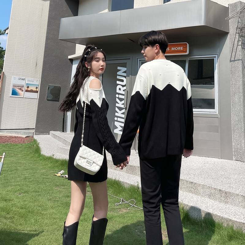 法式情侣装高级感毛衣甜辣风显瘦露肩针织连衣裙秋冬季撞色毛线衫