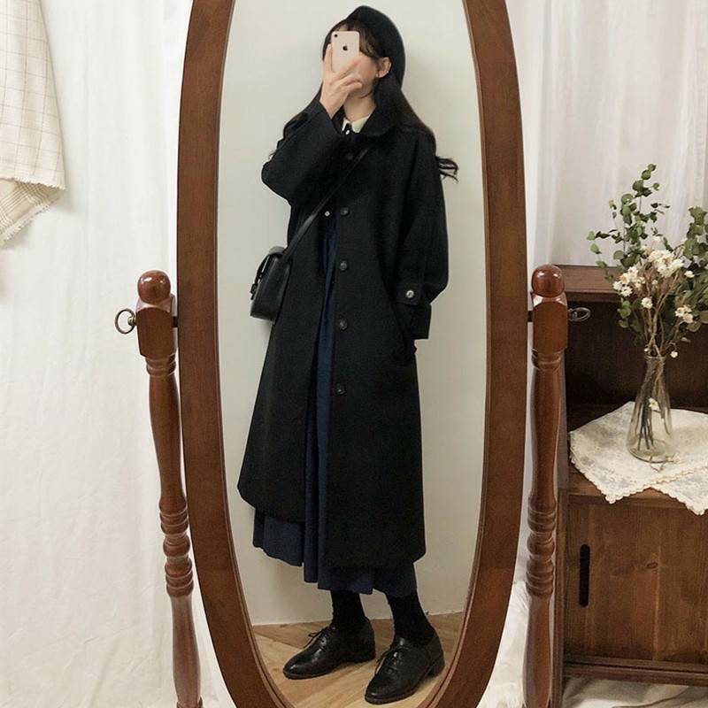 毛呢外套女中长款2021年新款秋冬季小个子黑色加厚赫本风呢子大衣