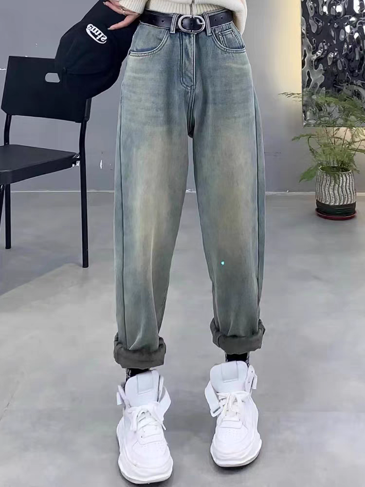 加绒加厚直筒男友女潮ins冬季洋气时尚胖MM高腰宽松阔腿裤