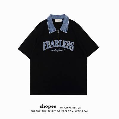 vintage美式复古牛仔领拼接刺绣polo衫短袖男女痞帅半拉链体恤潮